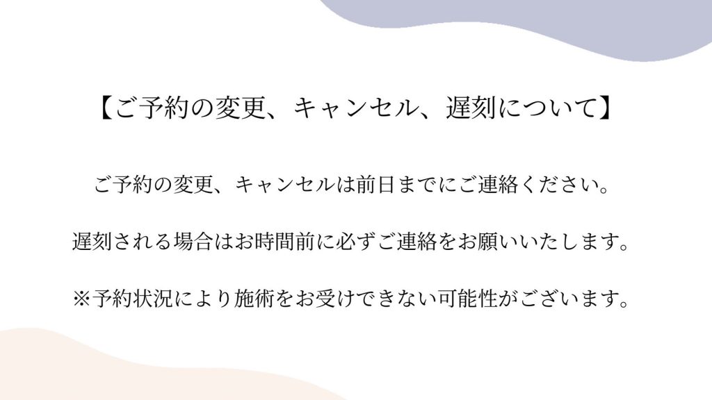 いつも当店をご愛顧いただきまして誠にありがとうございます。 オープンから沢山のお客様にお会いすることができとても嬉しい限りです! 本日はご予約の変更、キャンセル、遅刻についていくつかご案内をさせていただきます。 より多くのお客様に気持ちよく... -